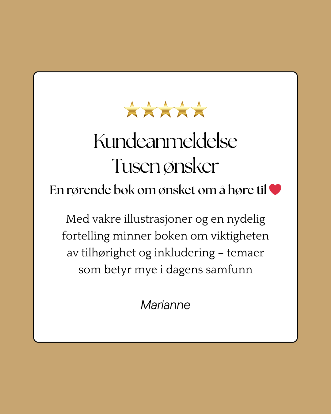 Jeg setter så pris på de temaene Wilhelmsen tar opp i sine bøker. Og jeg liker måten hun tar de opp på. Det er hjertevarmt, innsiktsfullt og sjarmerende skrevet. Jeg håper boka når ut til mange små og store lesere."